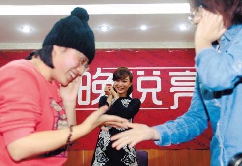 在新片《我愛的是你愛我》中,王珞丹和張涵予一段邊唱著經典老歌《友誼花開萬里香》,邊互相敬禮、扇耳光的劇情,既搞笑又有愛——歌是大叔愛的老歌,但游戲形式卻流露出屬于小妞的活潑。這段戲極受“丹磁”們的喜愛,以90后為主的他們不僅把這首老歌唱得滾瓜爛熟,更把它戲稱為“耳光歌”。昨日本報做客活動的最高潮,就是王珞丹挑選兩對“丹磁”現場表演,而她則在身后唱起這首活潑的“耳光歌”。得知王珞丹親自參與這個環(huán)節(jié),現場“丹磁”們卻有些靦腆,王珞丹卻對兩組選手們說:“別羞澀嘛!你們靠我近一點!”貼心的王珞丹還特意講了一遍規(guī)則:“石頭剪子布,出一樣的敬禮,贏了的打輸了的——只能打手捂的那面,別太用力哦!”